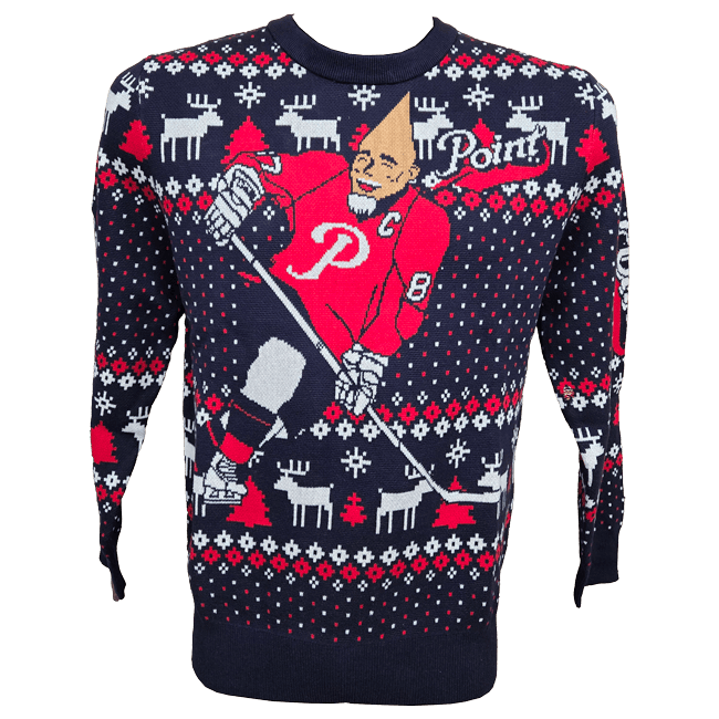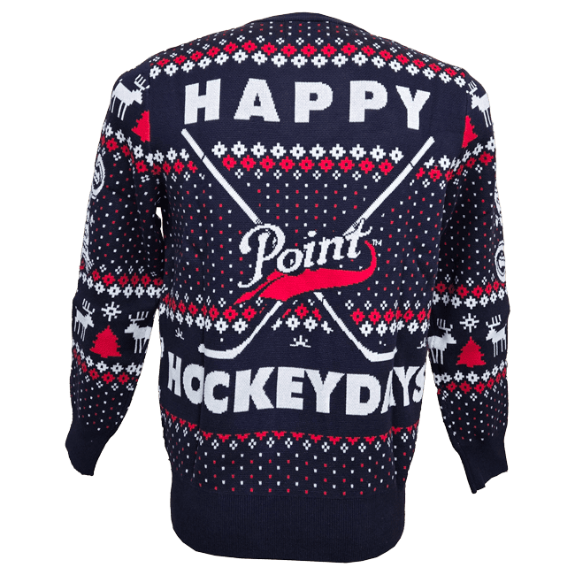 Stay warm with the Point Hockey Knit Sweater, featuring a fun design of the iconic conehead playing hockey. Made from 100% cotton, this sweater offers both comfort and style for chilly days. Says Happy Hockeydays on the back.